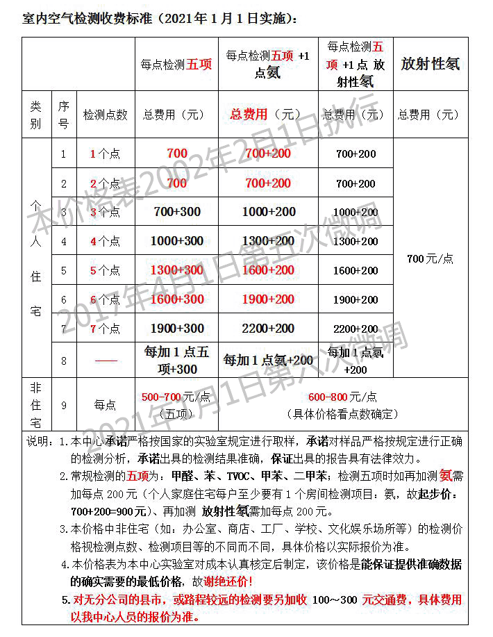 7.㈢、以上价格仅限个人家庭住宅内的空气检测;对无分公司的县市上门检测一律另加收 100~300 元交通费,具体费用视情形而定。  7.㈣、办公室、商店、工厂、学校、文化娱乐场所等的检测价格视检测点数、检测项目等的不同而不同,具体价格需视现场实际情形而定。